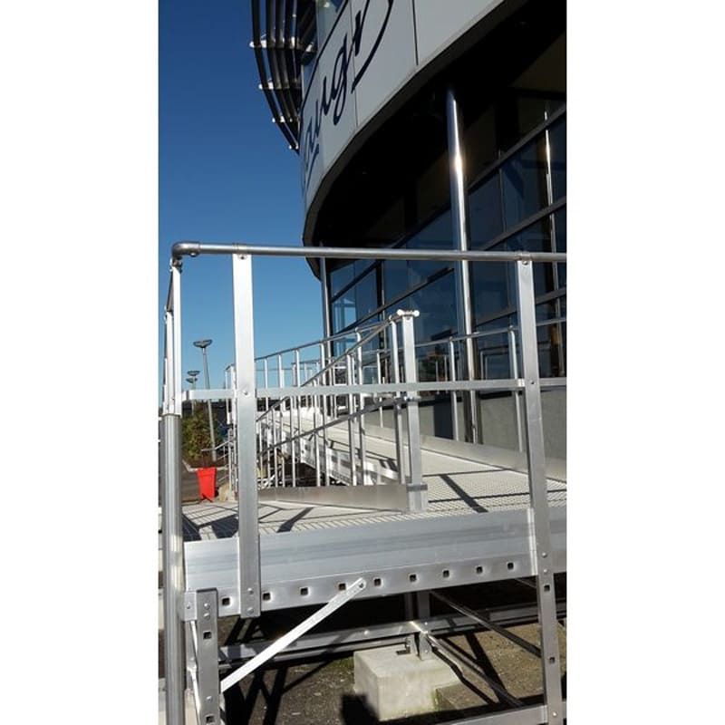 Chaque rampe est équipée de caillebotis composite antidérapant et de garde-corps latéraux de sécurité, avec lisse, sous-lisse et plinthe.