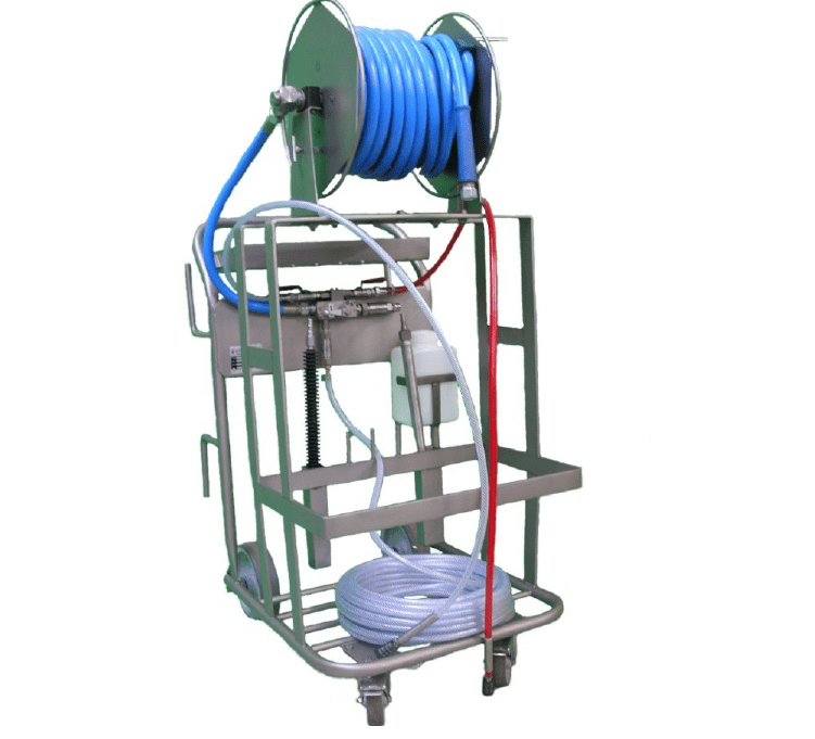 Disponible avec ou sans enrouleur, cette station de désinfection mobile est l'auxiliaire indispensable de vos opérations de moussage et de lavage haute et moyenne pression en milieu alimentaire ou à exigence d'hygiène (agriculture, cuisine centrale, laboratoire).