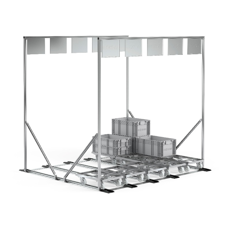 Notre système de supermarché FIFO est un dispositif lean management qui s'articule autour de l'installation au sol de rails de guidage et d'accumulation pour les bases roulantes.