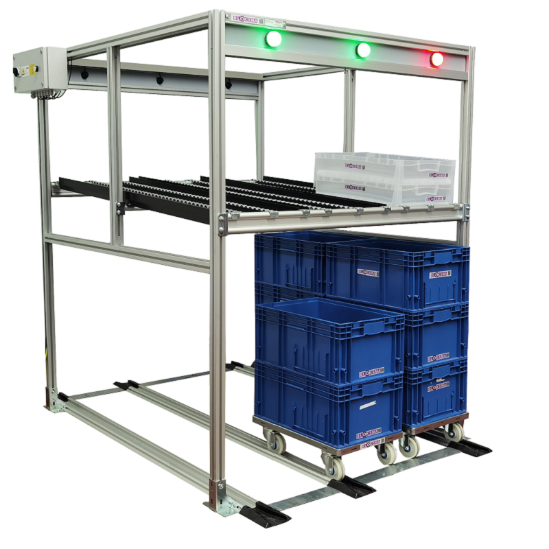 - Structure Kanban : dans le même esprit de gestion de roulement, la structure Kanban, intégrée dans la structure entrée et sortie, à la hauteur qui vous conviendra le mieux, permet le complément d’emballages individuels qui ne nécessitent un approvisionnement en masse.