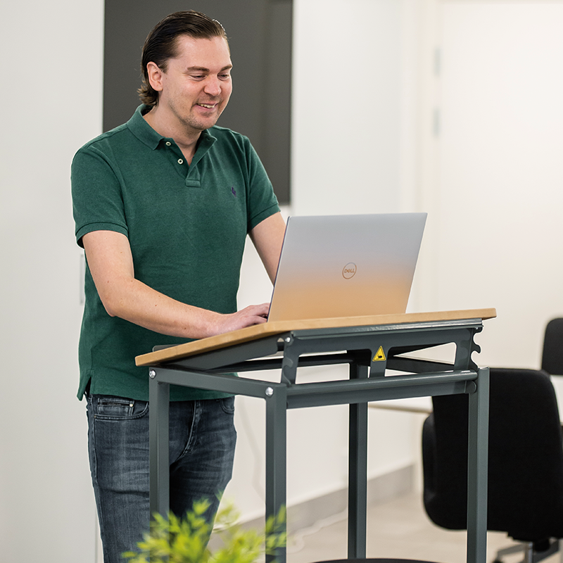 Disponible avec un plateau en bois clair ou gris, cette table de travail mobile est réglable en hauteur et idéale pour travailler debout dans différents environnements.