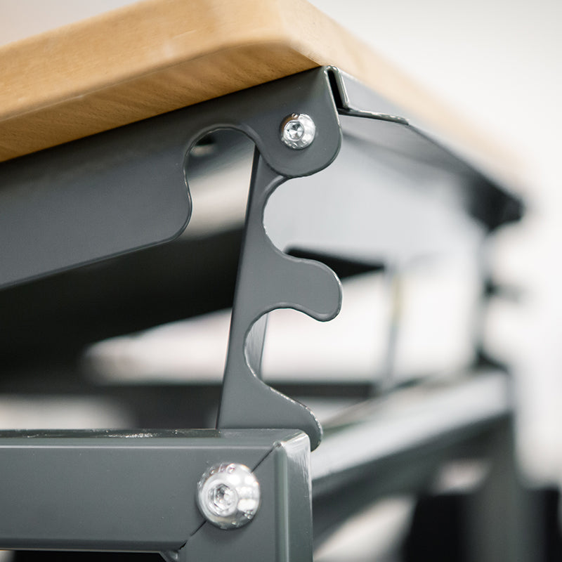 Polyvalent, ce mobilier professionnel est disponible avec un plateau en bois clair ou gris. *Sa version S propose un plateau inclinable qui améliore l'ergonomie de l'opérateur.