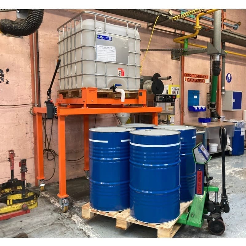 La table inclinable fixe ou mobile LRE EVO constitue un poste de soutirage et de vidange pour tout type de conteneur GRV IBC Palbox Palcom, Cuve Tangko, etc.