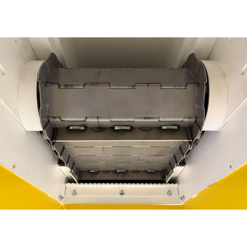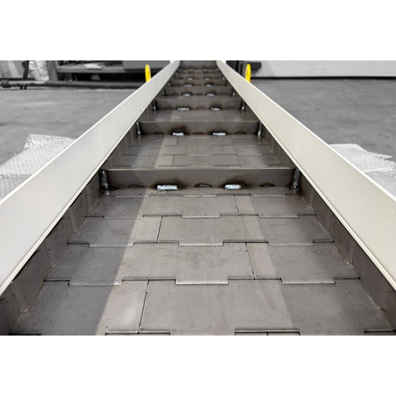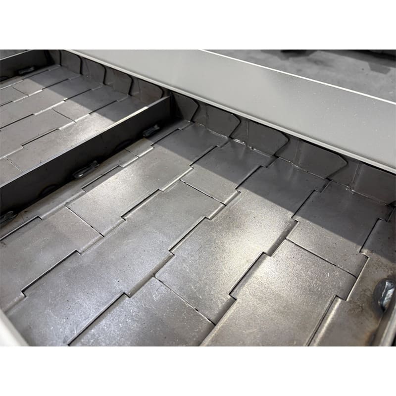 Pour répondre aux spécifications du cahier des charges, nous l’avons équipé avec un convoyeur à tapis métallique lisse au pas de 63 mm et à barrettes soudées tous les 5 pas.