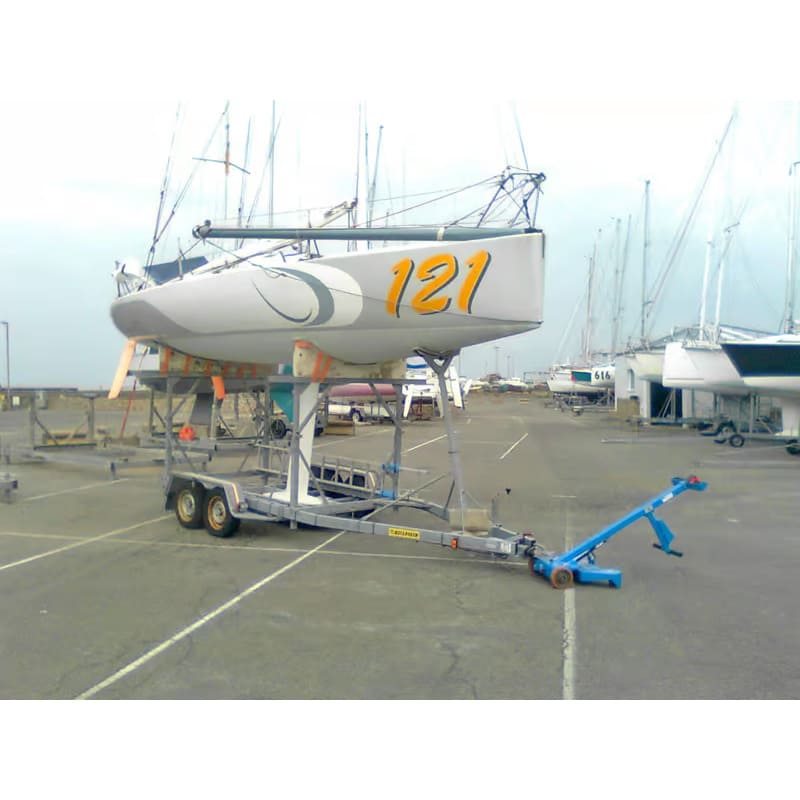 La boule d’attelage réglable du timon soulève le plateau de quelques centimètres du sol par un principe de levier assisté, de façon à apporter la moitié du poids sur les roues fixes du chariot.