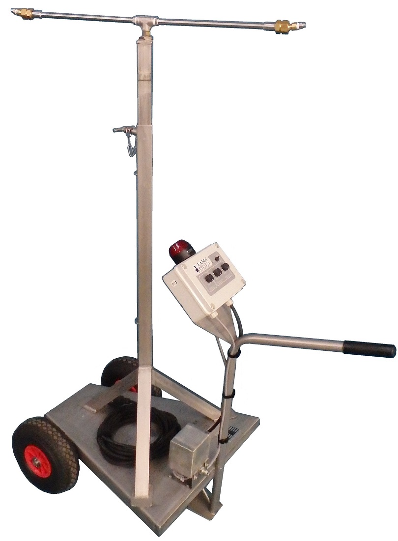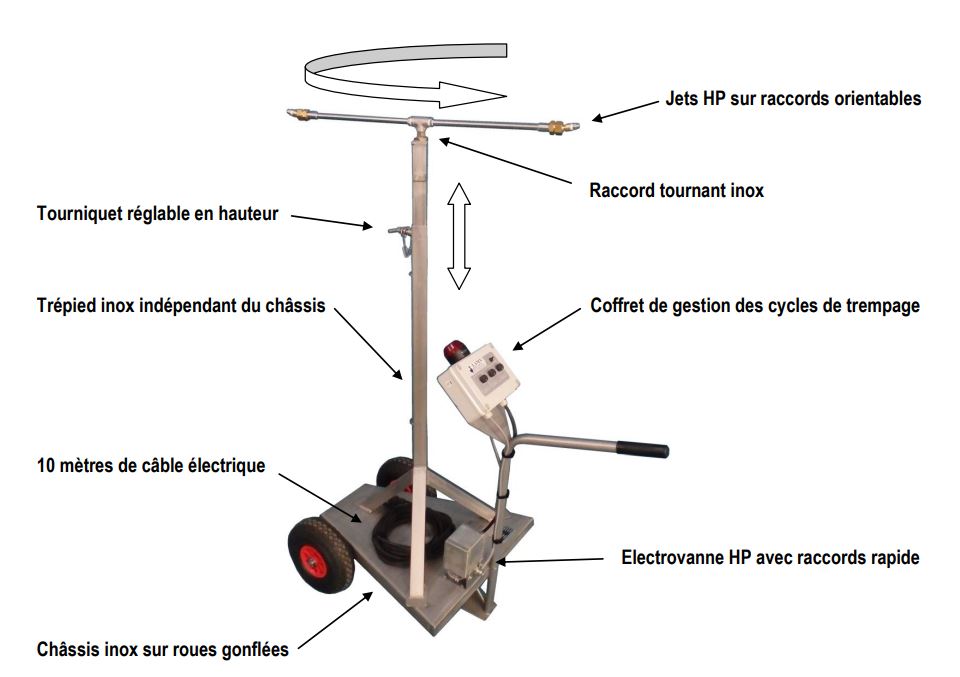 Son mât est réglable en hauteur et la partie en rotation repose sur un raccord tournant inox. Les extrémités sont équipées de jets haute pression sur raccords orientables.