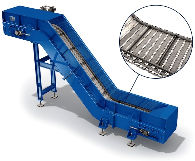 D'une robustesse exceptionnelle, le convoyeur à copeaux T100 est équipé d'un tapis de transport au pas de 100 mm adapté au transport de gros volumes de copeaux et de déchets de production.