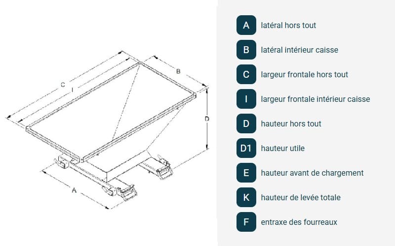 | Capacité litres | A | B | C | I | D | F | Poids kg | Référence Trémie |