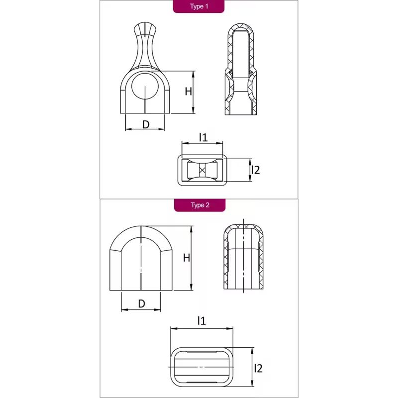 | Référence Essentra | ⌀ ext. compatible | H | l1 | l2 | Type |