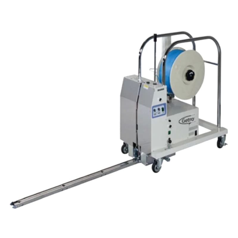 La D-53-PLTS est une cercleuse de palettes semi-automatique verticale à batterie, particulièrement adaptée pour le cerclage de palettes basses.