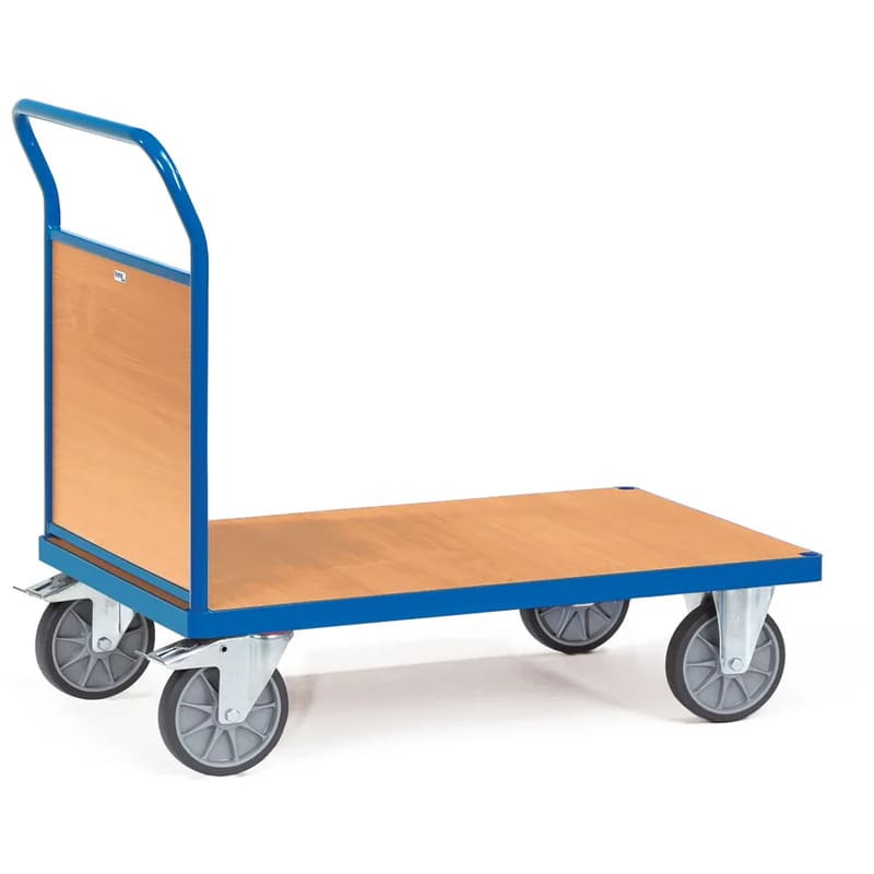 Ce chariot plateau multifonction est équipé d'un dossier bois plein, en mélaminé surface effet hêtre. Le dossier plein permet de transporter des produits, colis, paquets sans risque de chute dans le sens de la marche, la charge venant s'appuyer la ridelle (hauteur 500 mm).