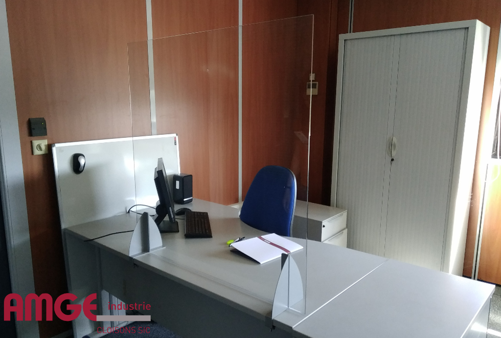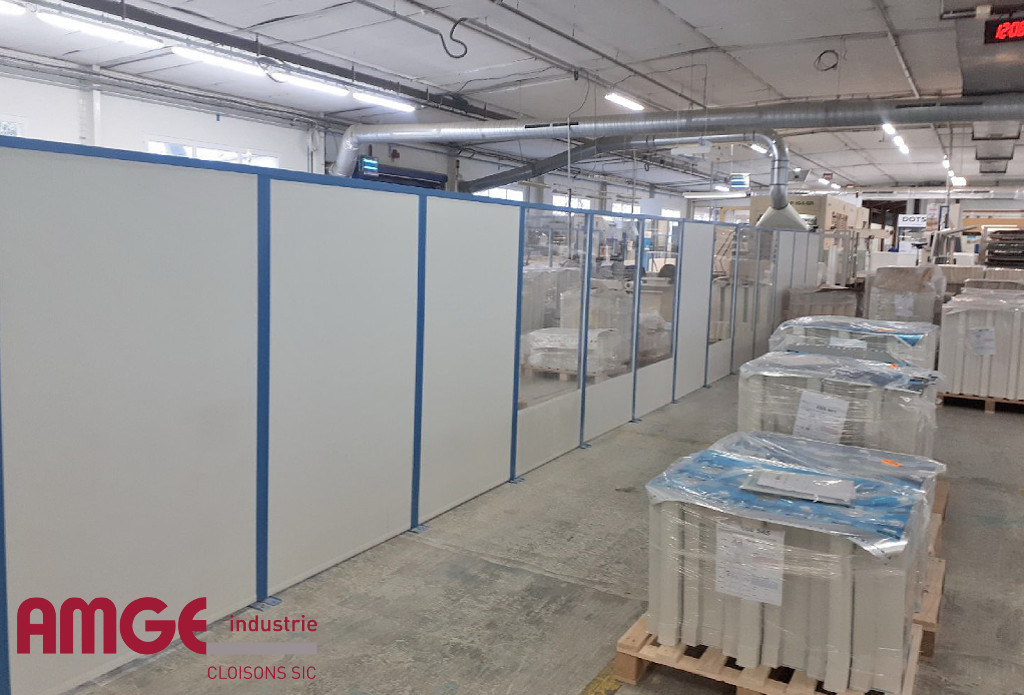 Spécialiste du cloisonnement d'atelier et de locaux, AMGE INDUSTRIE décline ses fabrications en cloisons cloisonnettes COVID.