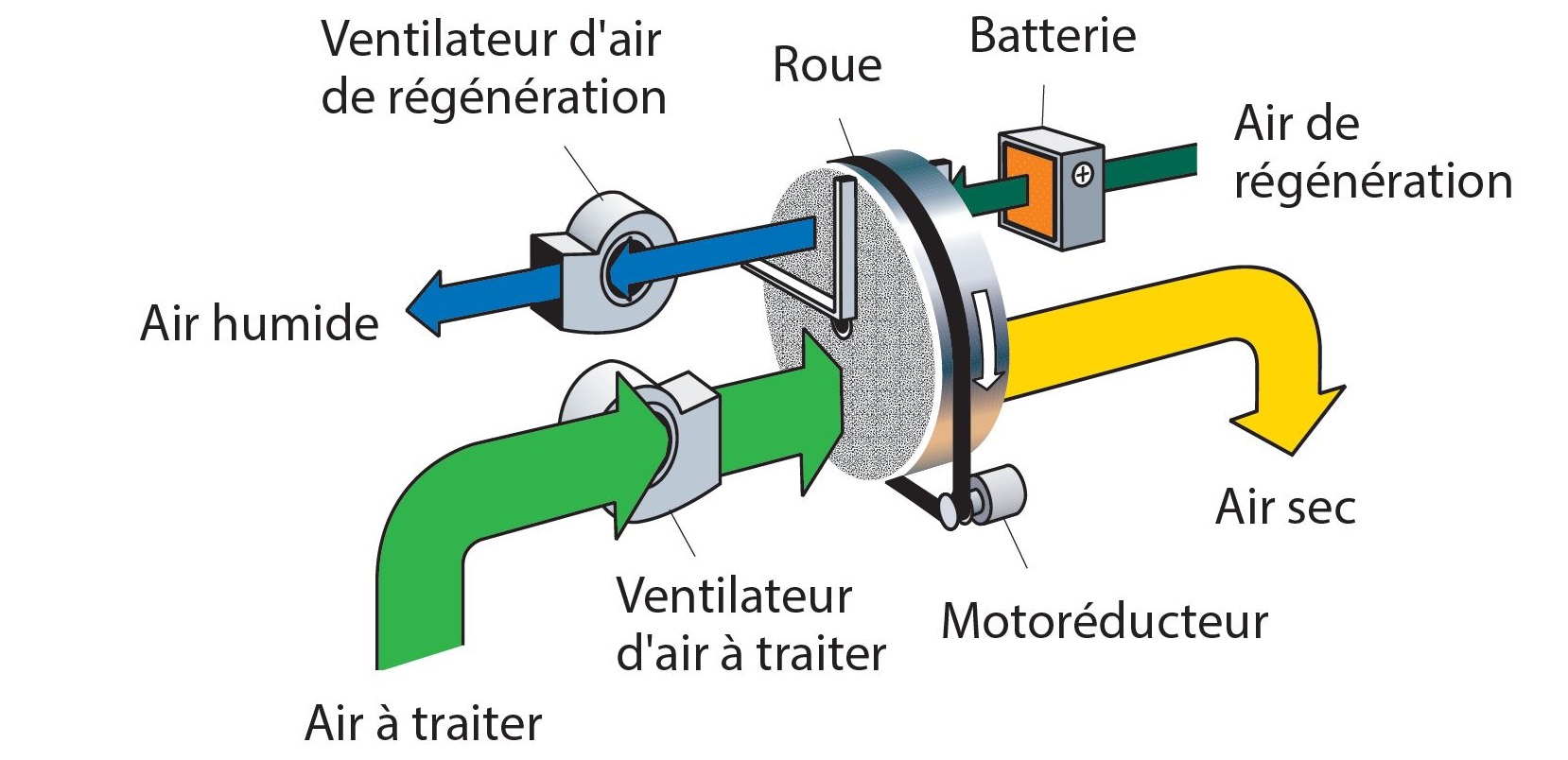 Le principe de déshydratation repose sur une roue lavable qui assure un fonctionnement sans perte d’absorbant et une maintenance limitée.