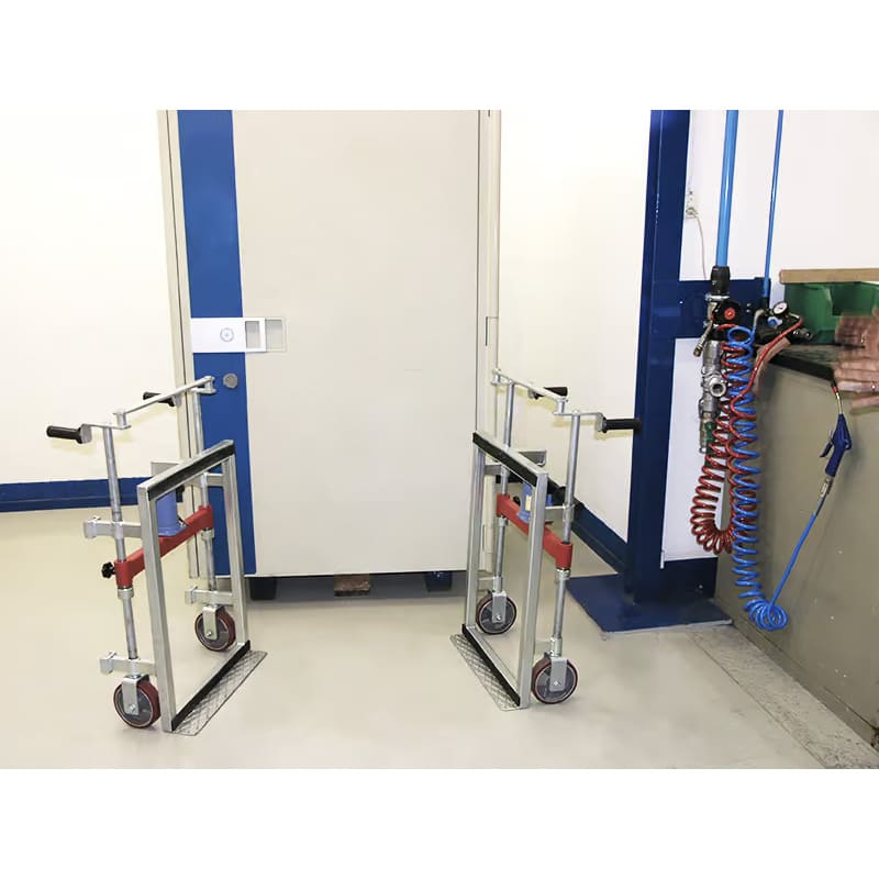 Composé de 2 éléments indépendants disposant chacun d’un dispositif de roulage orientable, d’un vérin de levage et d’une pelle d’appui, ces 2 chariots se positionnent à chaque extrémité du colis à déplacer.