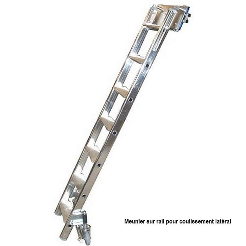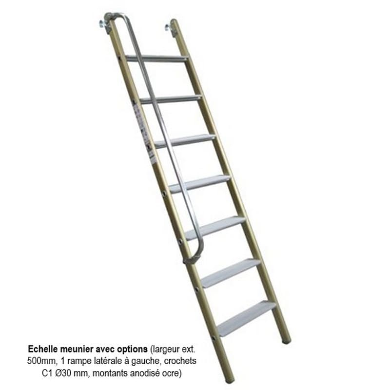 Sur l'échelle meunier, les barreaux sont remplacés par de véritables marches afin de faciliter un usage intensif et une position très stable d'accès. 2 profondeurs de marches 90 mm (matériel standard) ou 120mm, sont disponibles. Chaque marche est filée nervurée et antidérapante. Base rapportée fixe sur ces échelles au delà d'une longueur de 3000 mm.