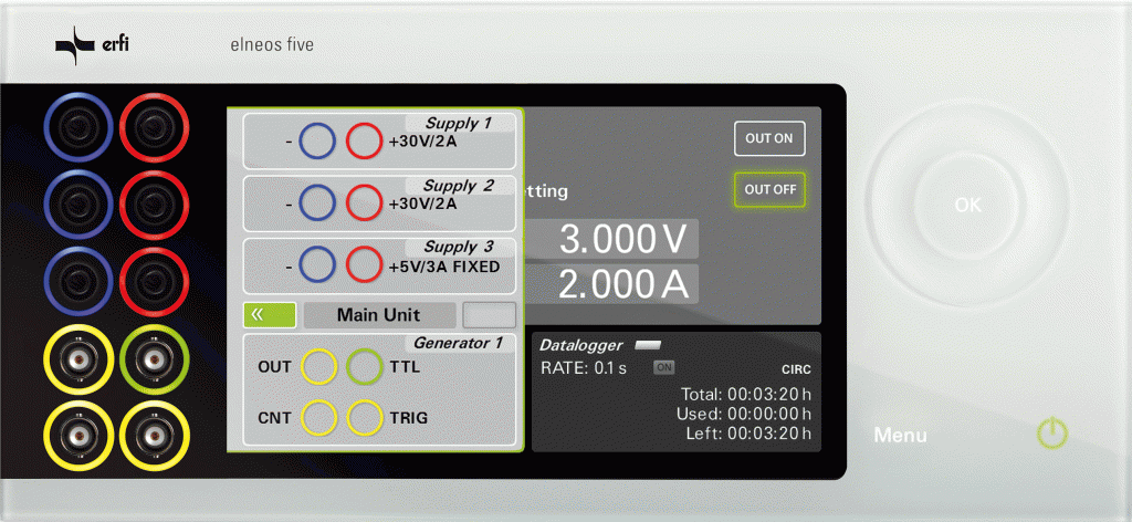Le module Elneos Five est appareil de mesure multifonction et d'alimentation de laboratoire électronique. Il est disponible sous forme d’appareils de table ou de pouvoir l’intégrer dans un rack standardisé de 19’’.