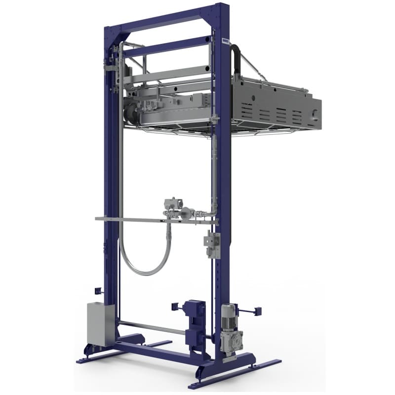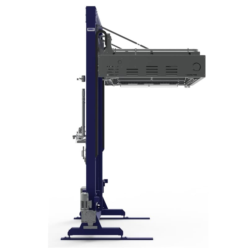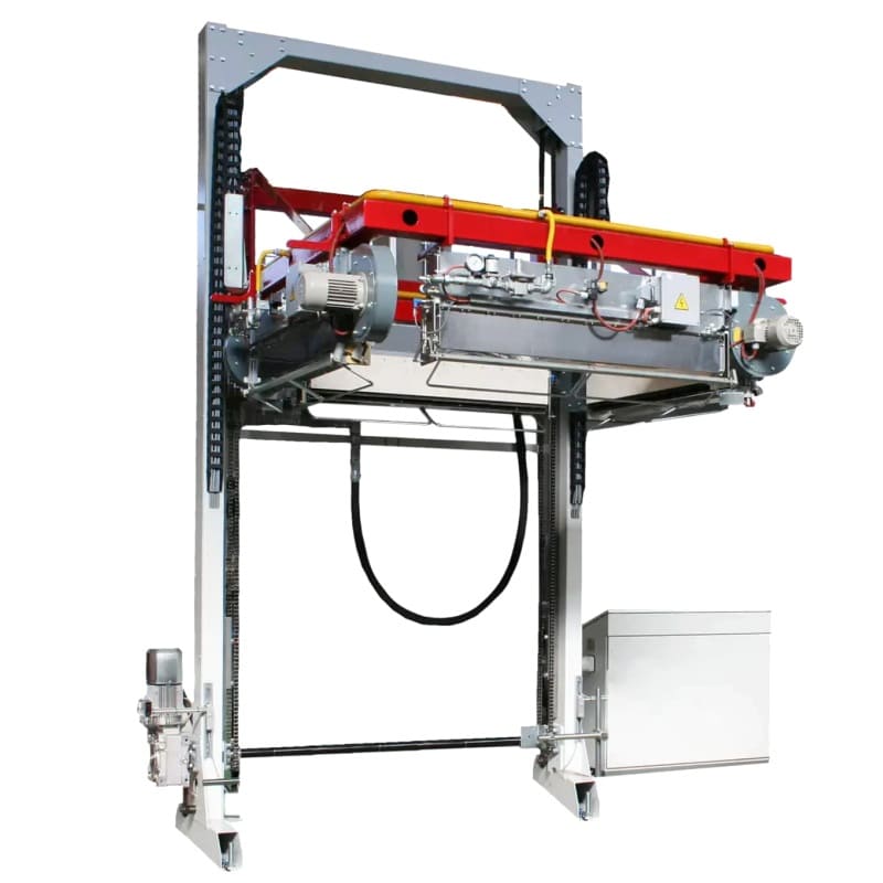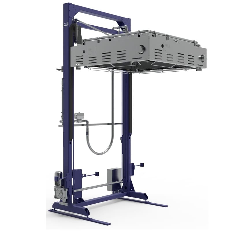 Avec cette machine, le film est chauffé et rétracté autour du produit grâce à un anneau équipé de brûleurs à gaz, qui descend autour de la charge pour assurer une rétraction uniforme et efficace.