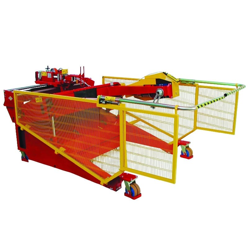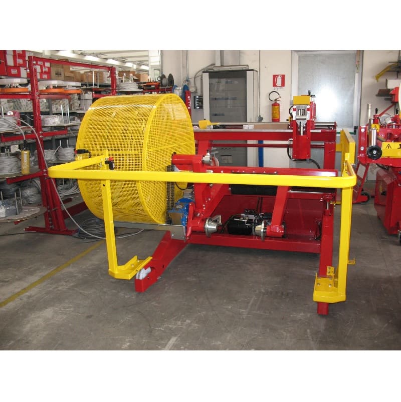La machine enrouleuse automatique Série CD/M3-BM2 de NICOLETTI est dédiée aux utilisations intensives. La prise du touret s'effectue entre deux pointes, le soulèvement est hydraulique et les bras mobiles sont actionnés par une télécommande. Elle permet :