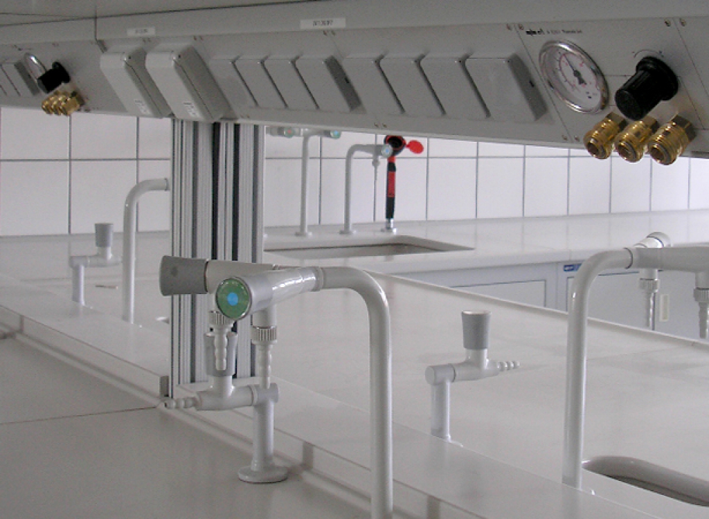 Les raccords pour l’eau ou les composants tels que les douches oculaires, les éviers, les surfaces de drainage et les lave-vaisselles sont intégrés dans les tables de laboratoire.