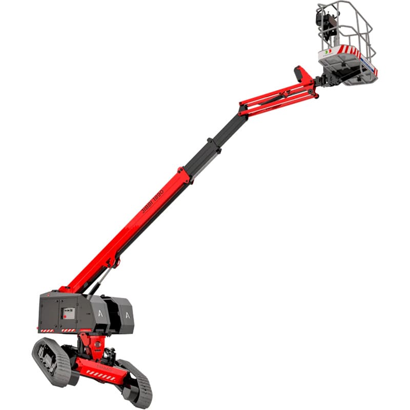 La nacelle automotrice télescopique JIBBI 1890 PRiMO est une plateforme élévatrice à chenilles 18 mètres entièrement électrique, conçue pour les travaux en hauteur sur terrains complexes.