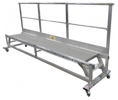 Cette plateforme de travail mobile, est une réalisation de longueur spéciale extrapolée de nos fabrication LONGDOCK. Sur la base d'une structure en alliage d'aluminium, la plate-forme est en caillebotis composite antidérapante.