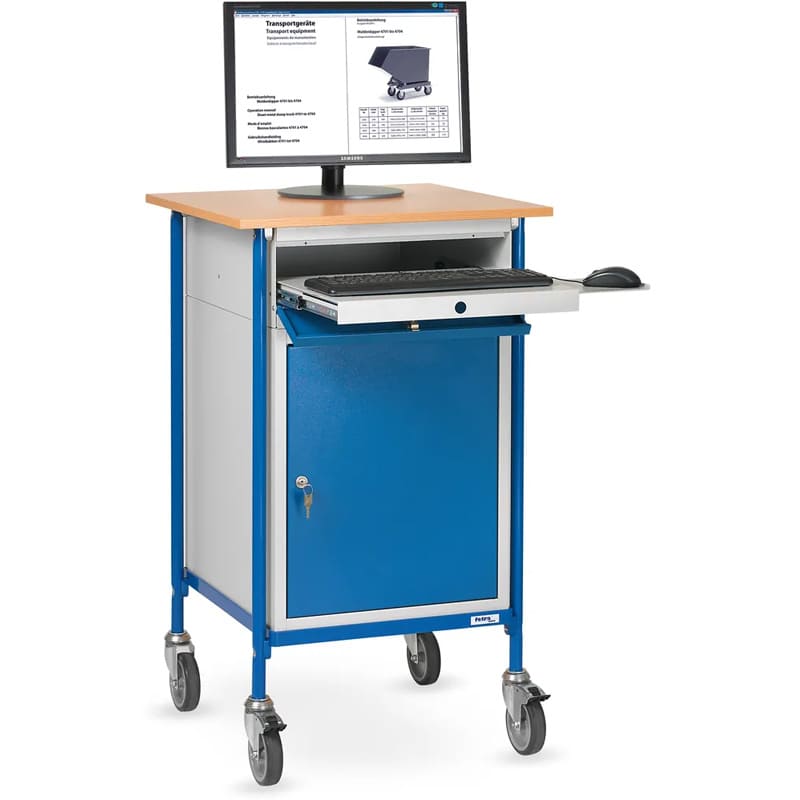 Charge 150 kg, dimensions utiles 650 x 650 mm avec placard et tiroir porte clavier et tapis de souris.