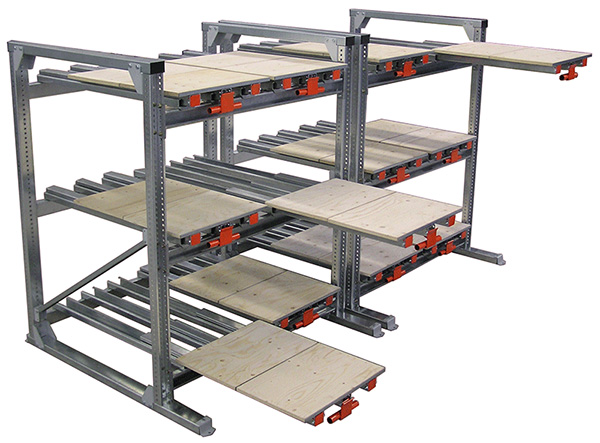 - le rack lourd regroupe les offres de type palettier statique, à accumulation ou dynamique, ou les cantilevers, et d'une manière générale les produits lourds, comme les palettes ou les produits de grandes tailles, produits longs notamment ; il contient également les solutions de stockage à tiroirs extractible
