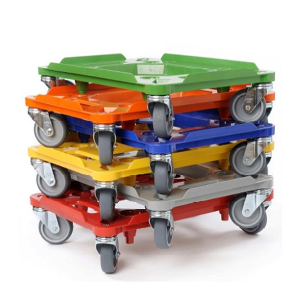 Les roule-bacs pour caisses plastiques normalisées peuvent être fabriqués en plastique, en métal ou en fil. Ils proposent généralement un entourage ou des coins pour le bon maintien de la caisse pendant le déplacement.