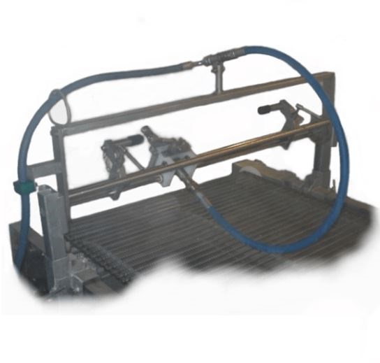 Le système de lavage se place autour du passage du tapis défilant. Il peut produire un jet moyenne ou haute pression ou encore de la vapeur selon les exigences du process.