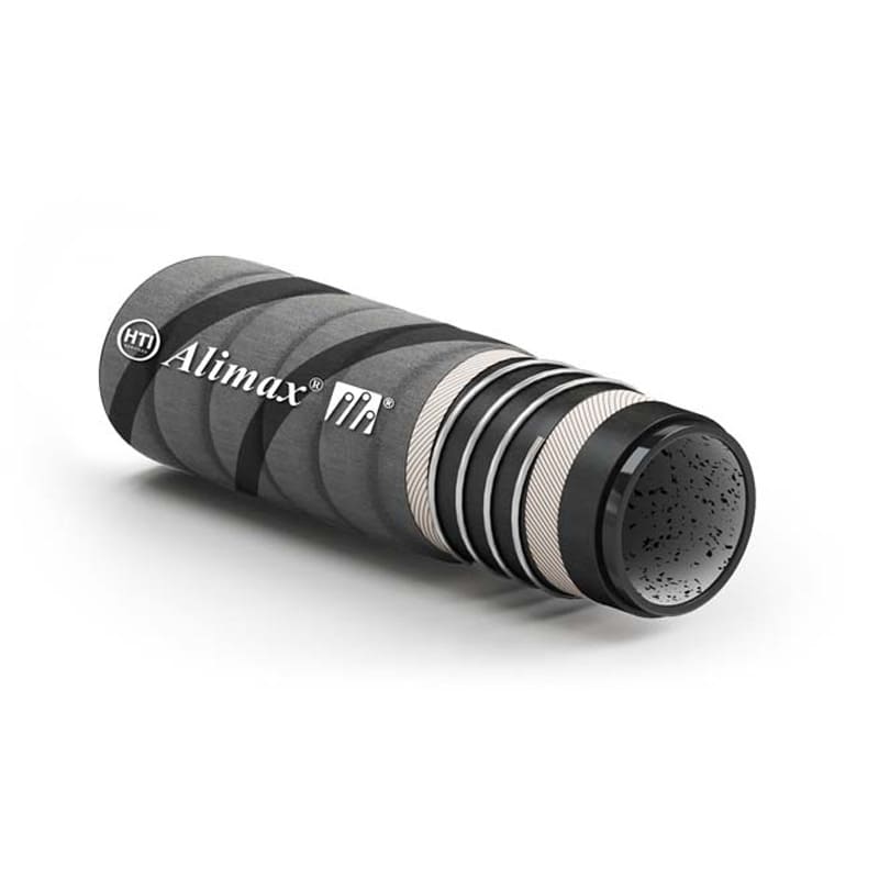 Renforcé par des trames textiles et des spirales noyées dans la paroi, le tuyau caoutchouc polyvalent Alimax UPE FC présente un revêtement extérieur en EPDM annelé gris à bande noire conductrice.