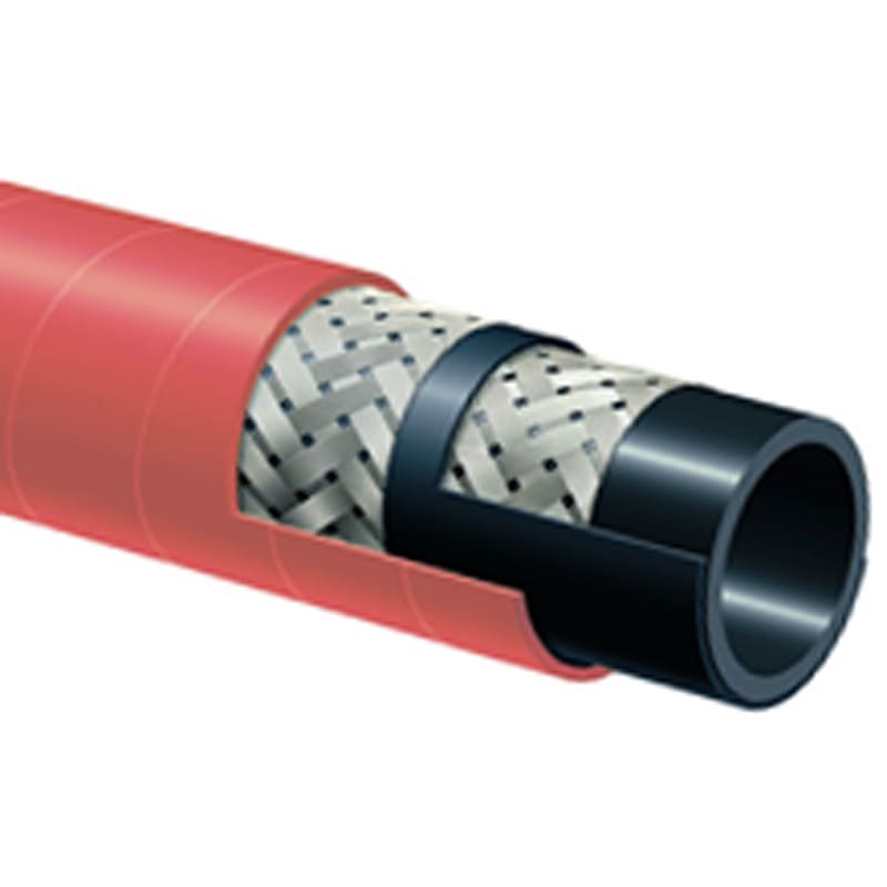 Destiné au passage de vapeur saturée, ce tuyau caoutchouc est composé d'un tube intérieur caoutchouc EPDM noir lisse, résistant à la chaleur et à la vapeur. Il est renforcé par tressage textile haute ténacité rouge.